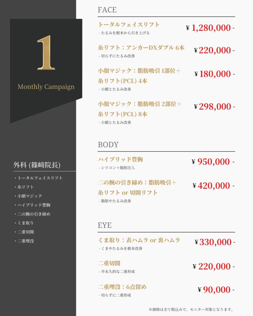 2025/12/28 キャンペーン 1月 外科(篠﨑院長)メニュー 1月 外科(篠﨑院長)メニュー メニュー詳細 施術 画像参照 期間 1/6(火)-1/31(土) 費用 画像参照 記事をシェアする リンクをコピー リンクをコピーしました 前の記事 一覧へ戻る 次の記事