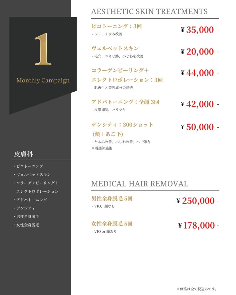 2025/12/28 キャンペーン 1月 皮膚科メニュー 1月 皮膚科メニュー メニュー詳細 施術 画像参照 期間 1/6(火)-1/31(土) 費用 画像参照 記事をシェアする リンクをコピー リンクをコピーしました 前の記事 一覧へ戻る 次の記事