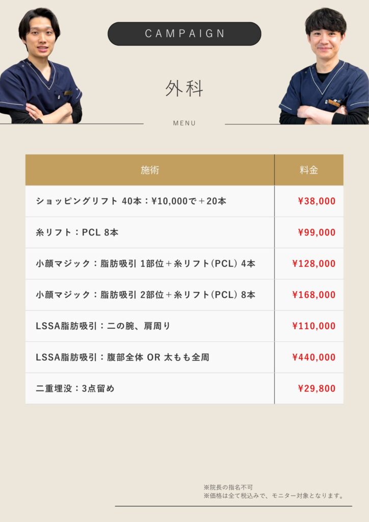2026/02/01 キャンペーン 2月 外科メニュー 2月 外科メニュー メニュー詳細 施術 画像参照 期間 2/1(日)-2/28(土) 費用 画像参照 記事をシェアする リンクをコピー リンクをコピーしました 前の記事 一覧へ戻る 次の記事