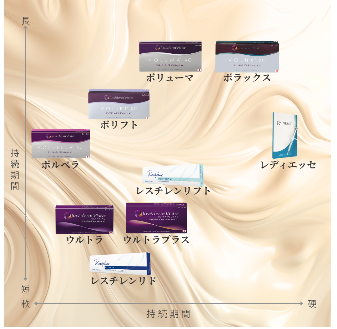 種類ごとに硬さや濃度が異なるため、ほうれい線や唇、頬など用途に応じて最適な仕上がりを目指せます。